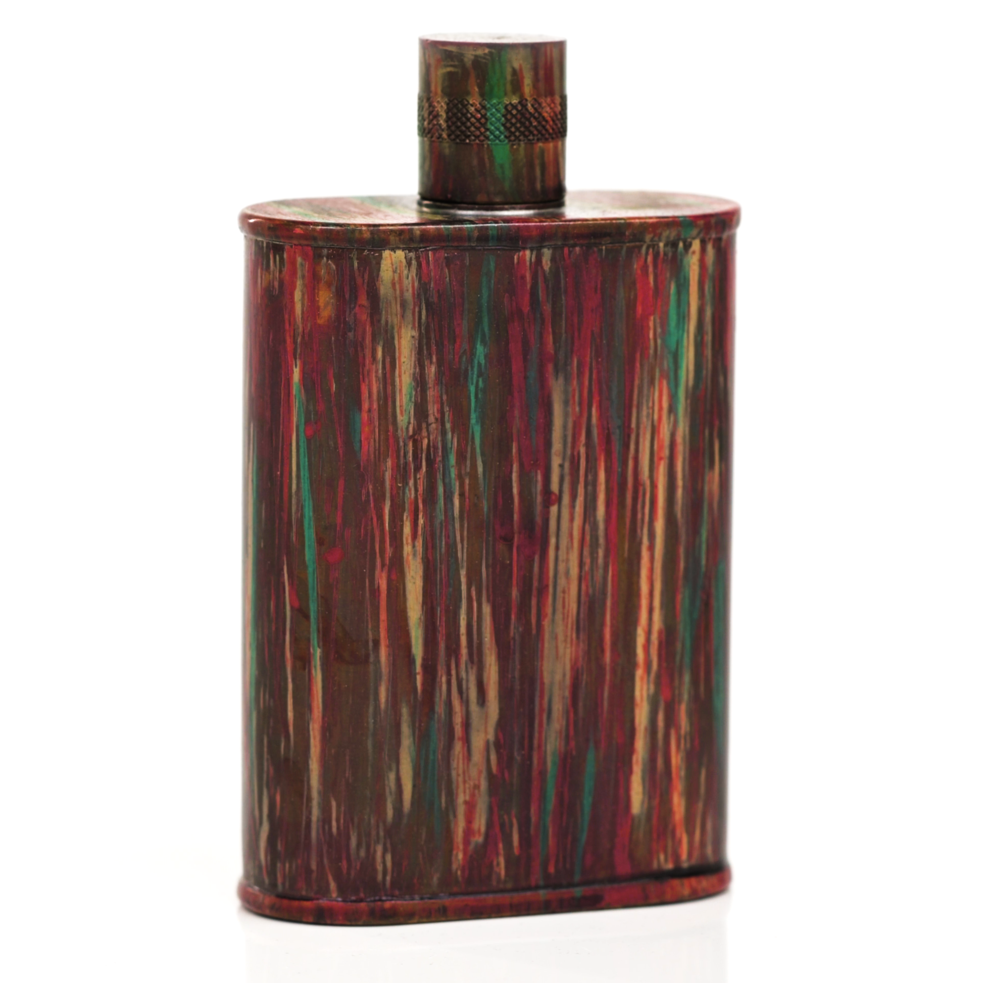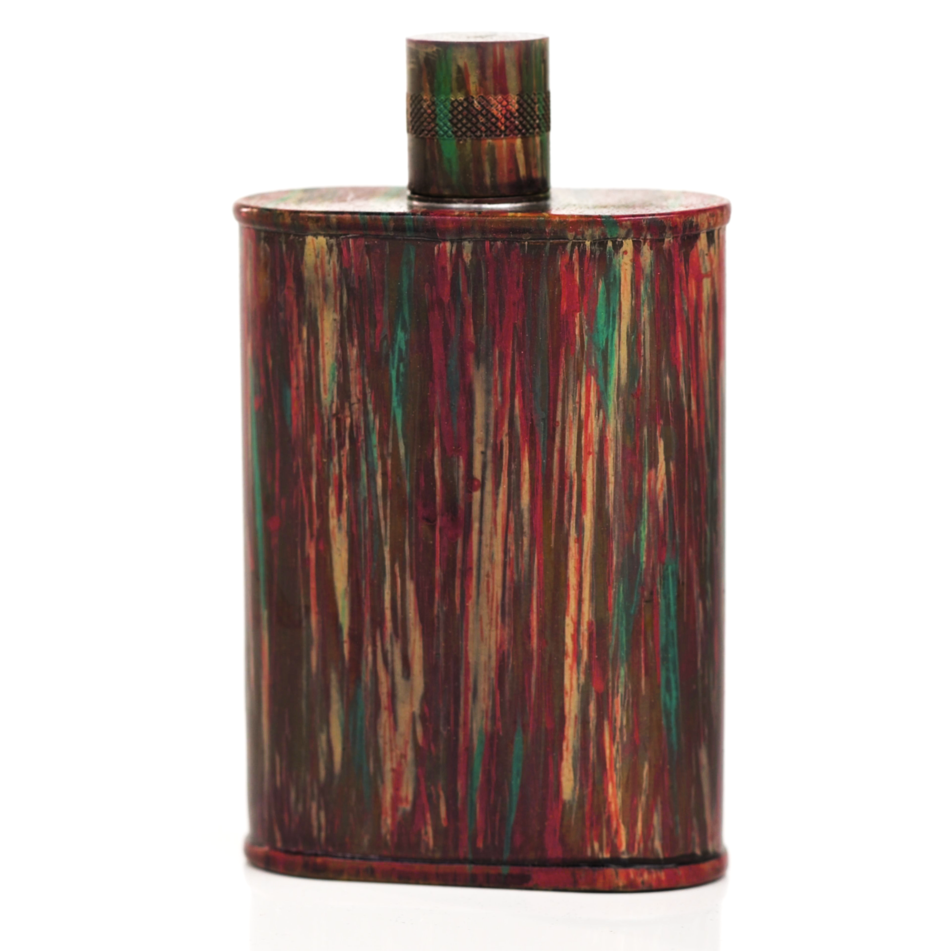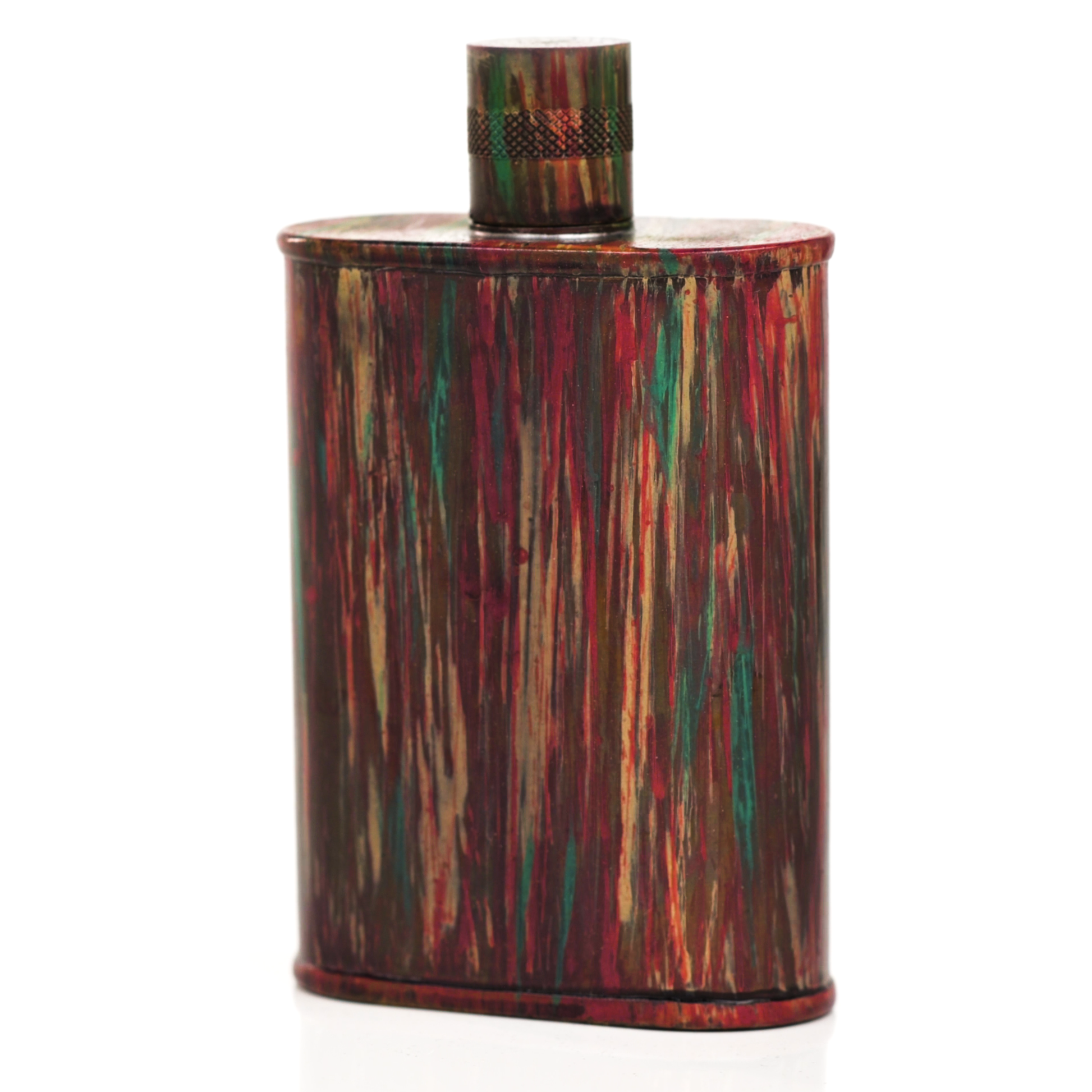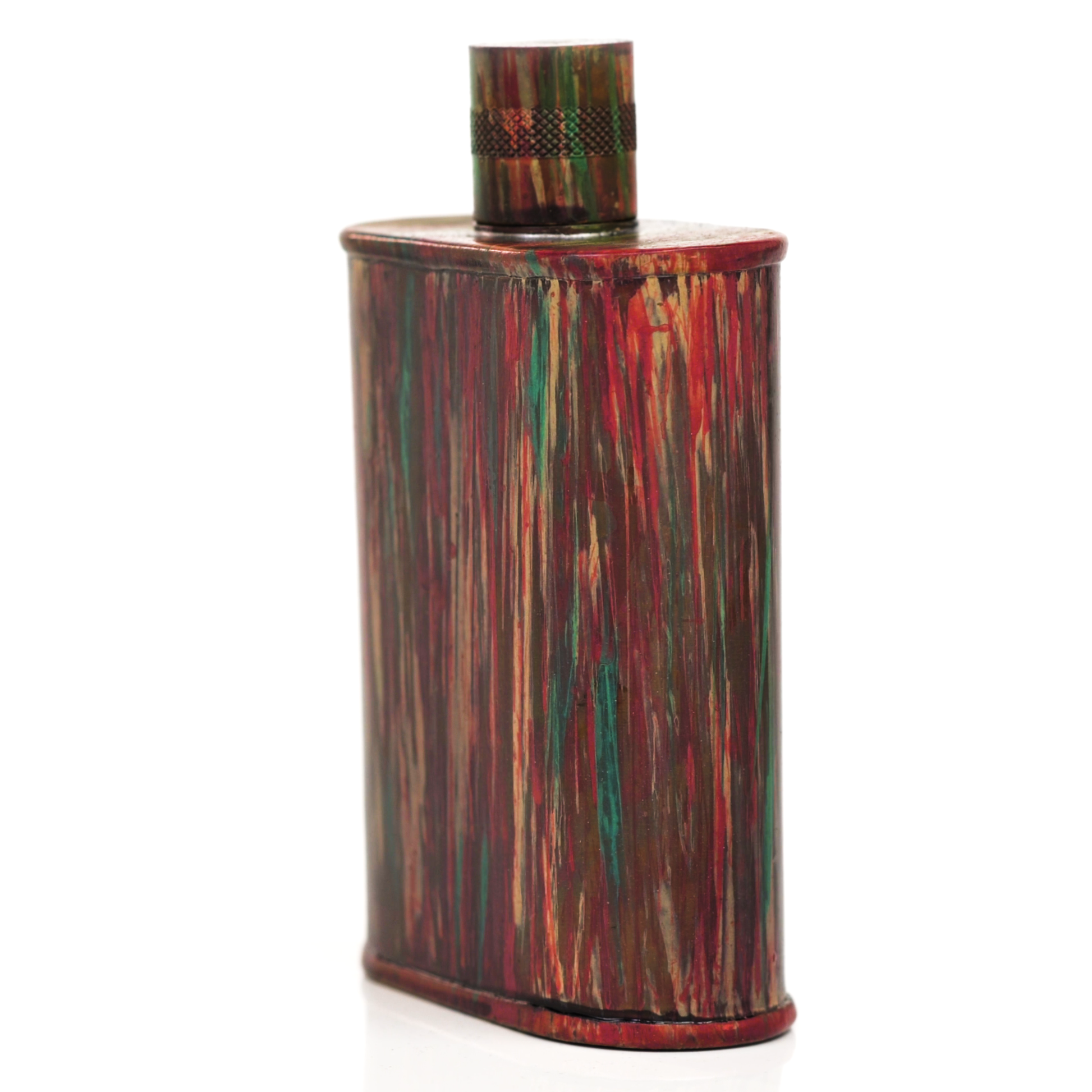 Using a special treatment process developed by Jacob Bromwell®, Enchantment takes on a warm glow like a campfire slowly winding down. The unique patina is achieved through our proprietary 3-step process—intended to replicate 30 years of aging—which includes hyper-oxidizing, heat treating, and light painting, sanding, and finishing. Its body is made of 22 gauge solid copper—finished off with a unique patina—while molten, lead-free tin is applied to the interior using a lost process that's trade-secret to our company. The end result is a uniquely individual flask like no other.