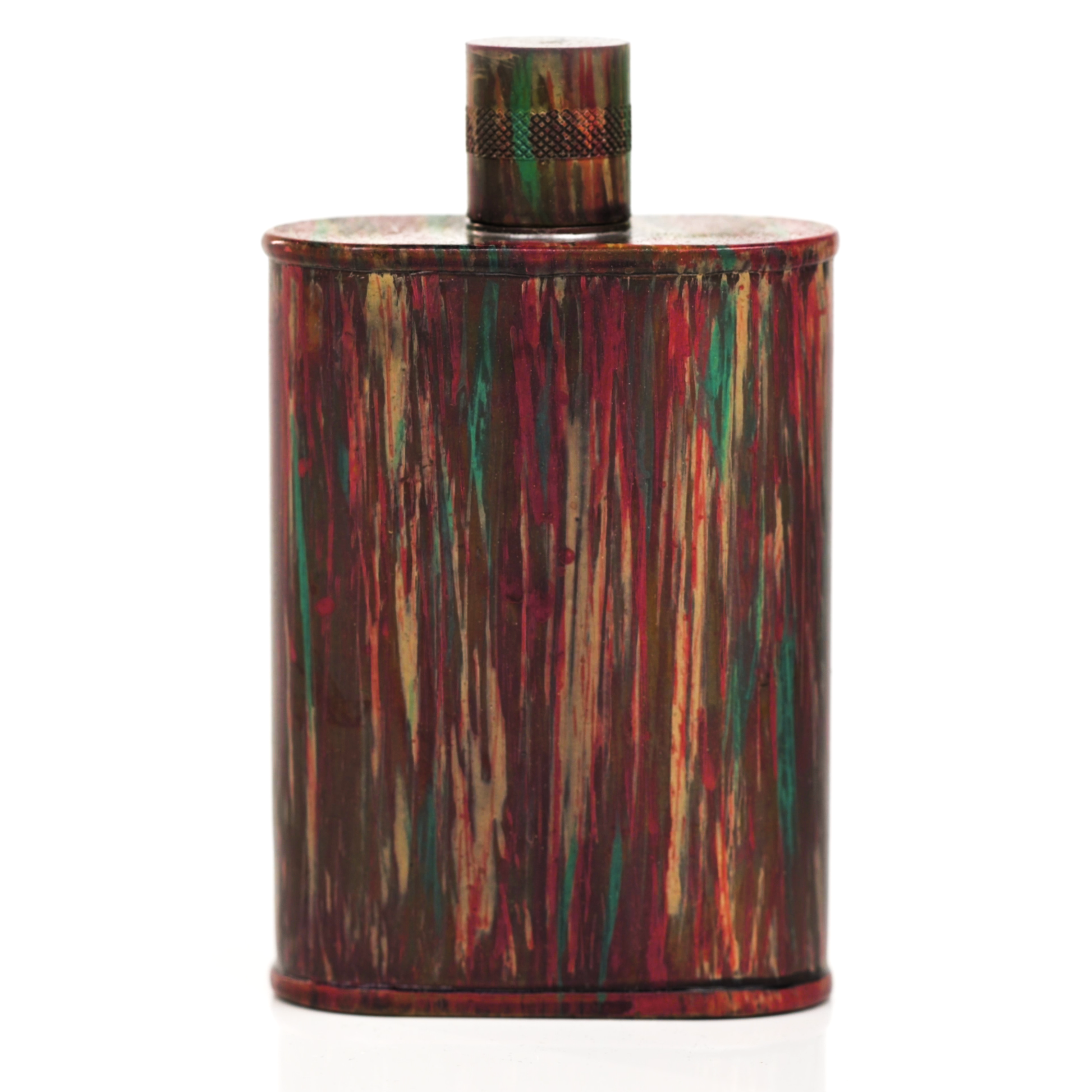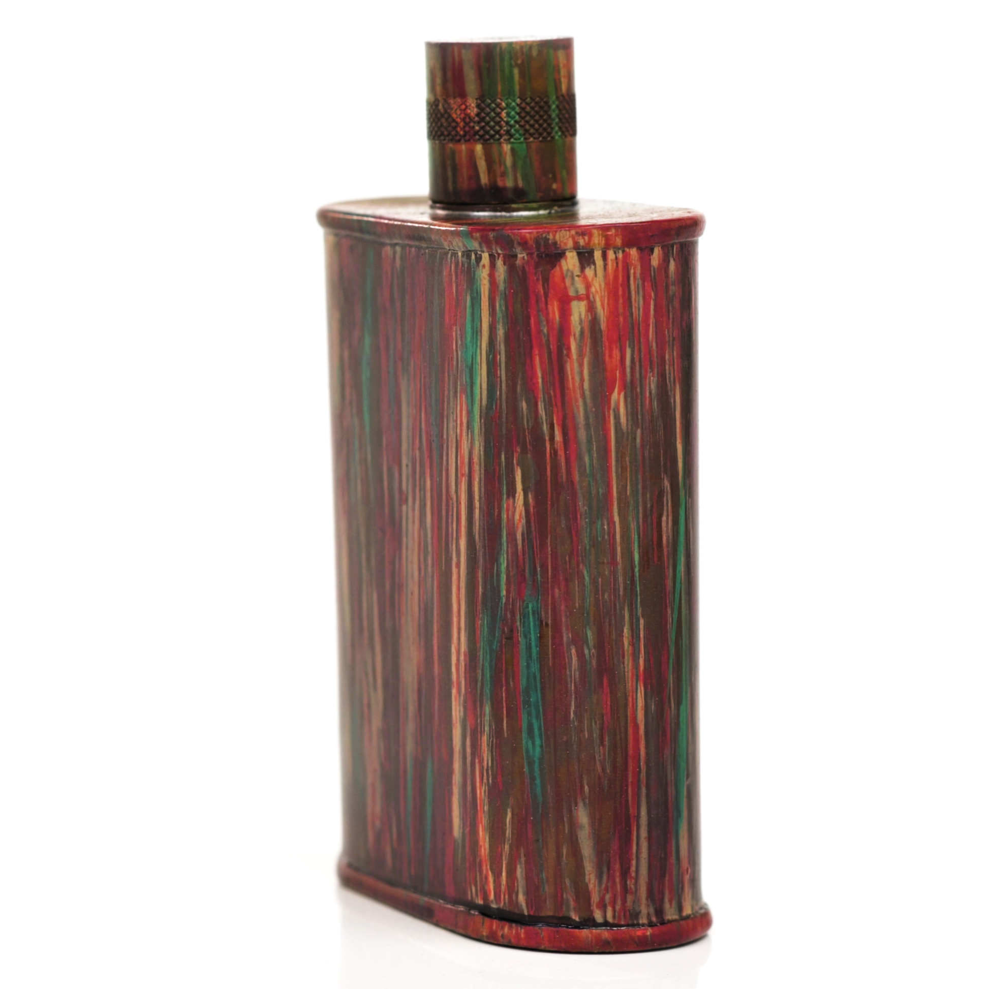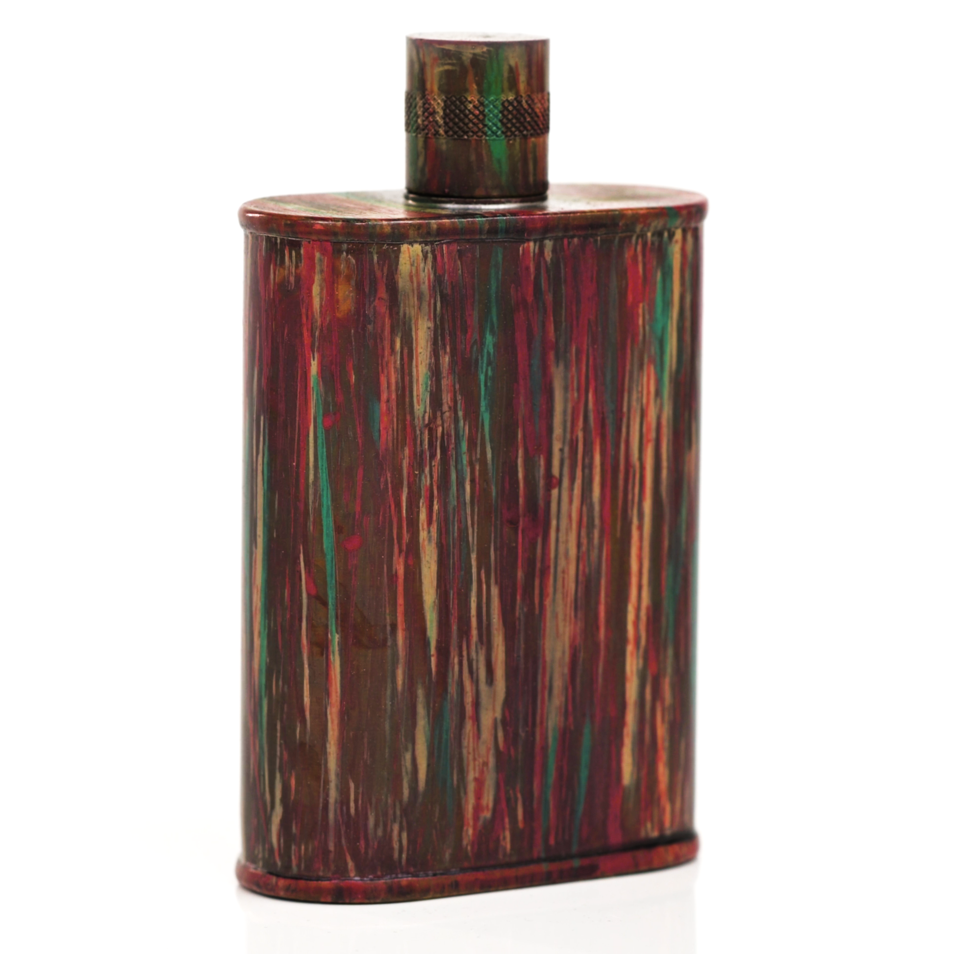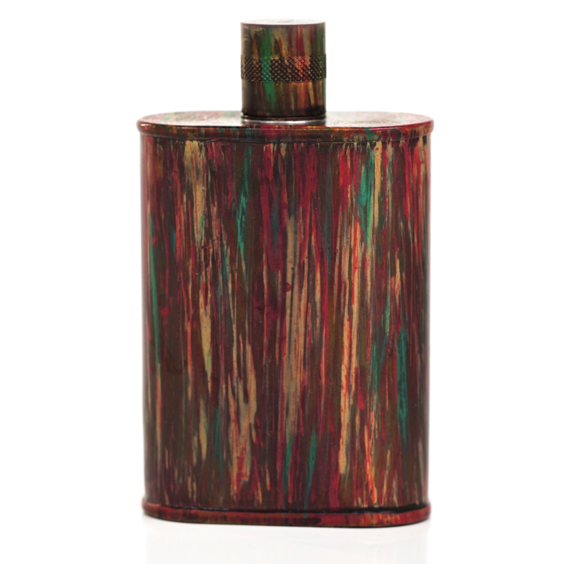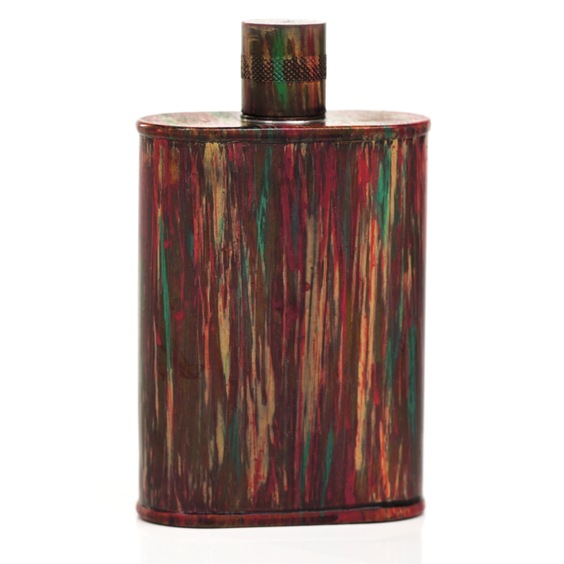 Using a special treatment process developed by Jacob Bromwell®, Enchantment takes on a warm glow like a campfire slowly winding down. The unique patina is achieved through our proprietary 3-step process—intended to replicate 30 years of aging—which includes hyper-oxidizing, heat treating, and light painting, sanding, and finishing. Its body is made of 22 gauge solid copper—finished off with a unique patina—while molten, lead-free tin is applied to the interior using a lost process that's trade-secret to our company. The end result is a uniquely individual flask like no other.