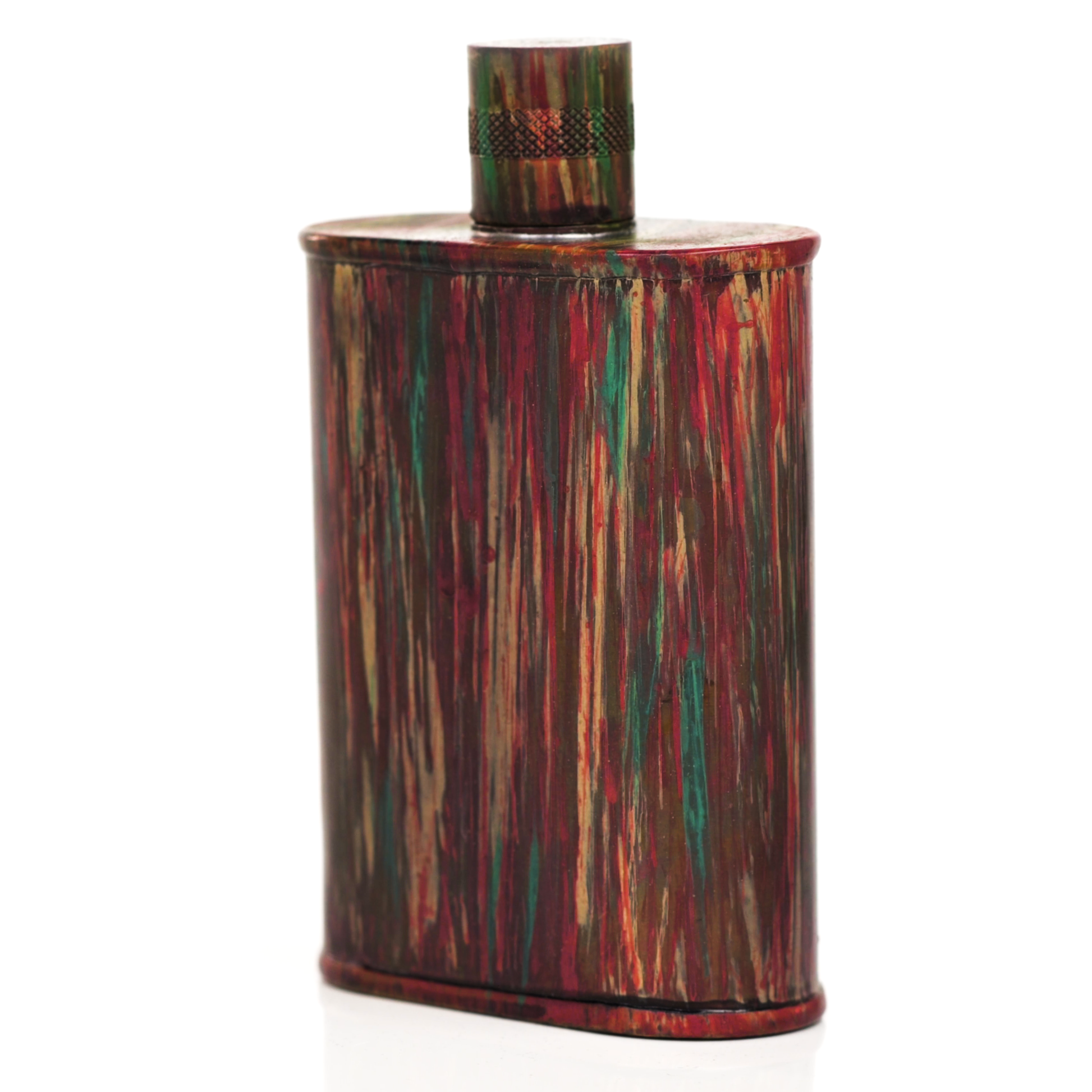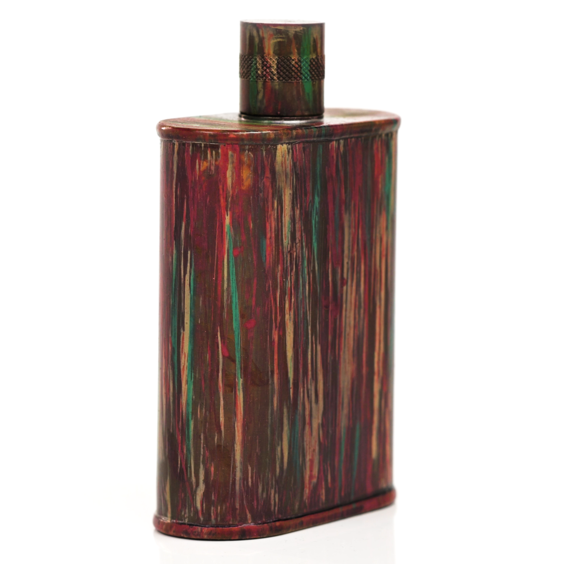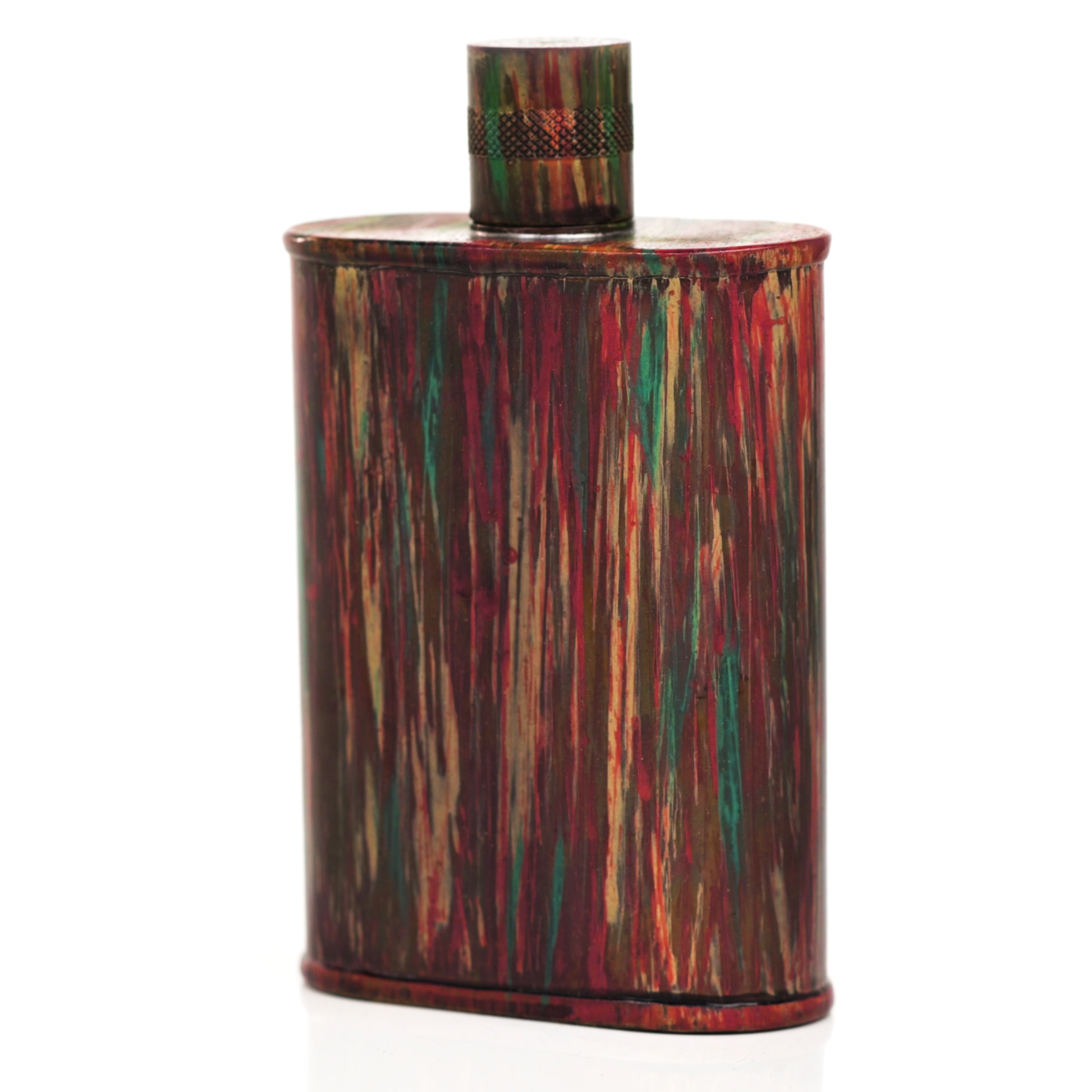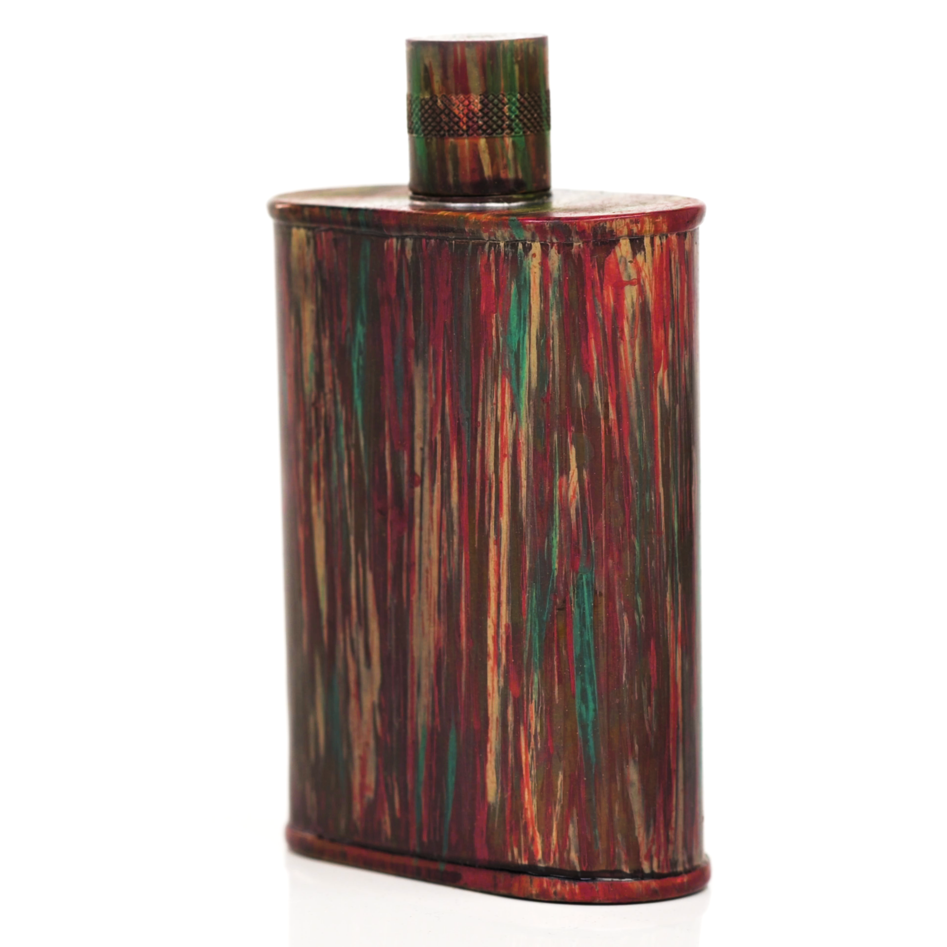 Using a special treatment process developed by Jacob Bromwell®, Enchantment takes on a warm glow like a campfire slowly winding down. The unique patina is achieved through our proprietary 3-step process—intended to replicate 30 years of aging—which includes hyper-oxidizing, heat treating, and light painting, sanding, and finishing. Its body is made of 22 gauge solid copper—finished off with a unique patina—while molten, lead-free tin is applied to the interior using a lost process that's trade-secret to our company. The end result is a uniquely individual flask like no other.