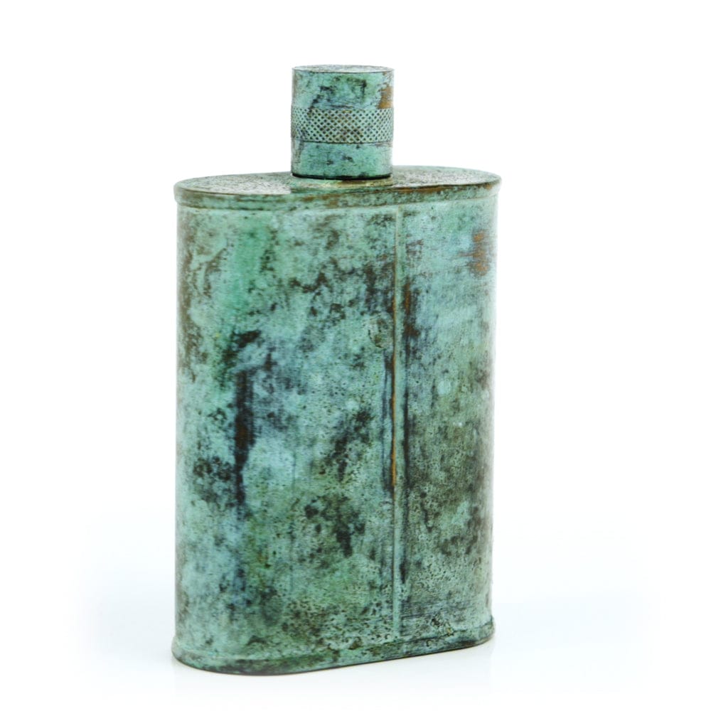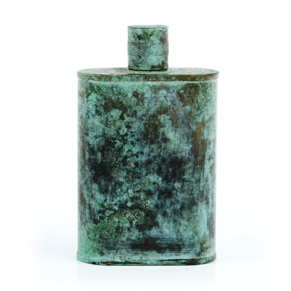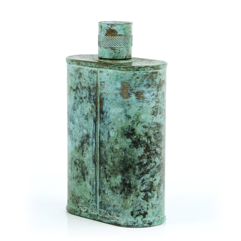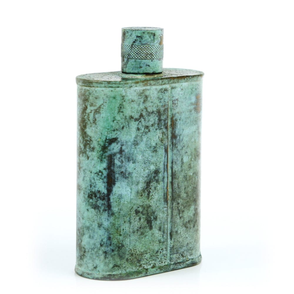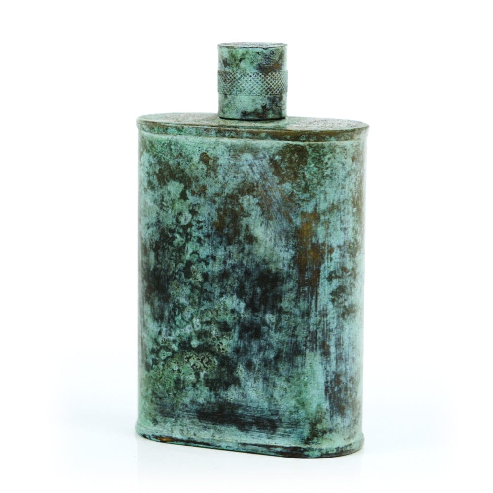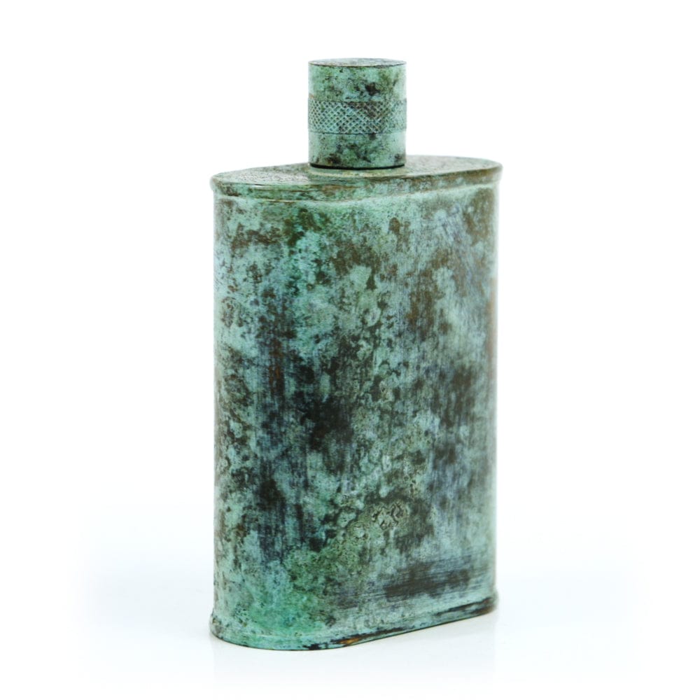 Pacific has been treated to take on a beautiful mottled green patina that gives it a vintage look, like it’s been allowed to oxidize and age. The patina is achieved through our proprietary 3-step process—intended to replicate 30 years of aging—which includes hyper-oxidizing, heat treating, and light painting, sanding, and finishing. Its body is made of 22 gauge solid copper—finished off with a unique patina—while molten, lead-free tin is applied to the interior using a lost process that's trade-secret to our company. The end result is a uniquely individual flask like no other.