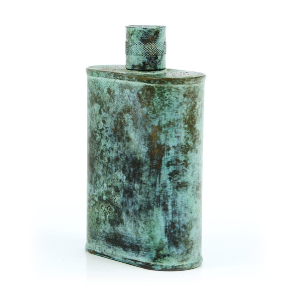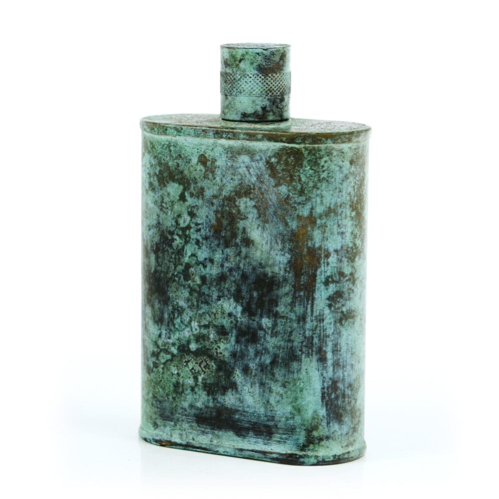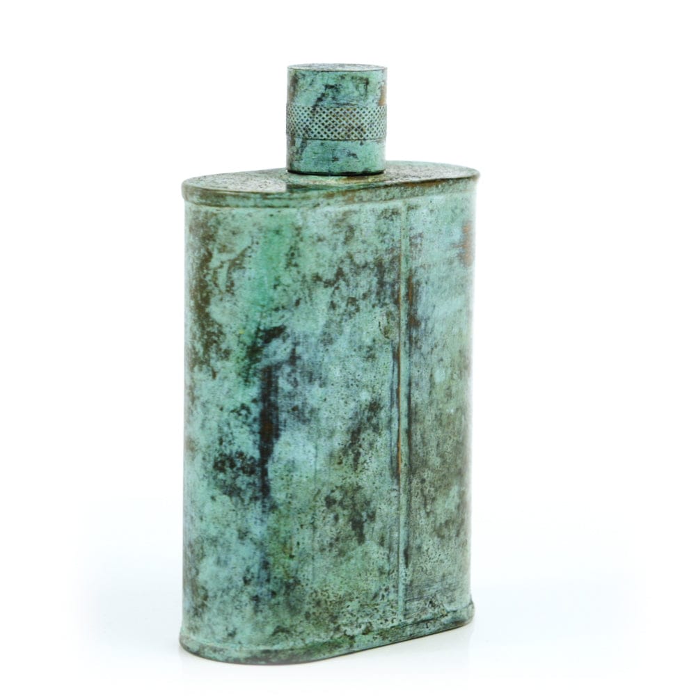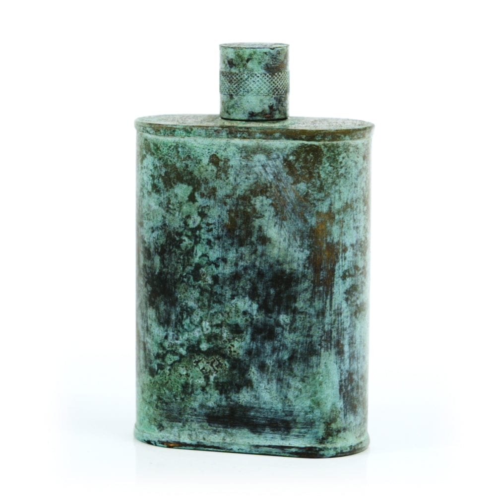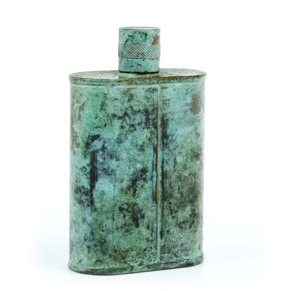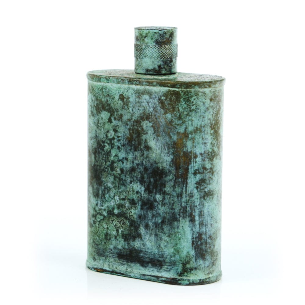 Pacific has been treated to take on a beautiful mottled green patina that gives it a vintage look, like it’s been allowed to oxidize and age. The patina is achieved through our proprietary 3-step process—intended to replicate 30 years of aging—which includes hyper-oxidizing, heat treating, and light painting, sanding, and finishing. Its body is made of 22 gauge solid copper—finished off with a unique patina—while molten, lead-free tin is applied to the interior using a lost process that's trade-secret to our company. The end result is a uniquely individual flask like no other.
