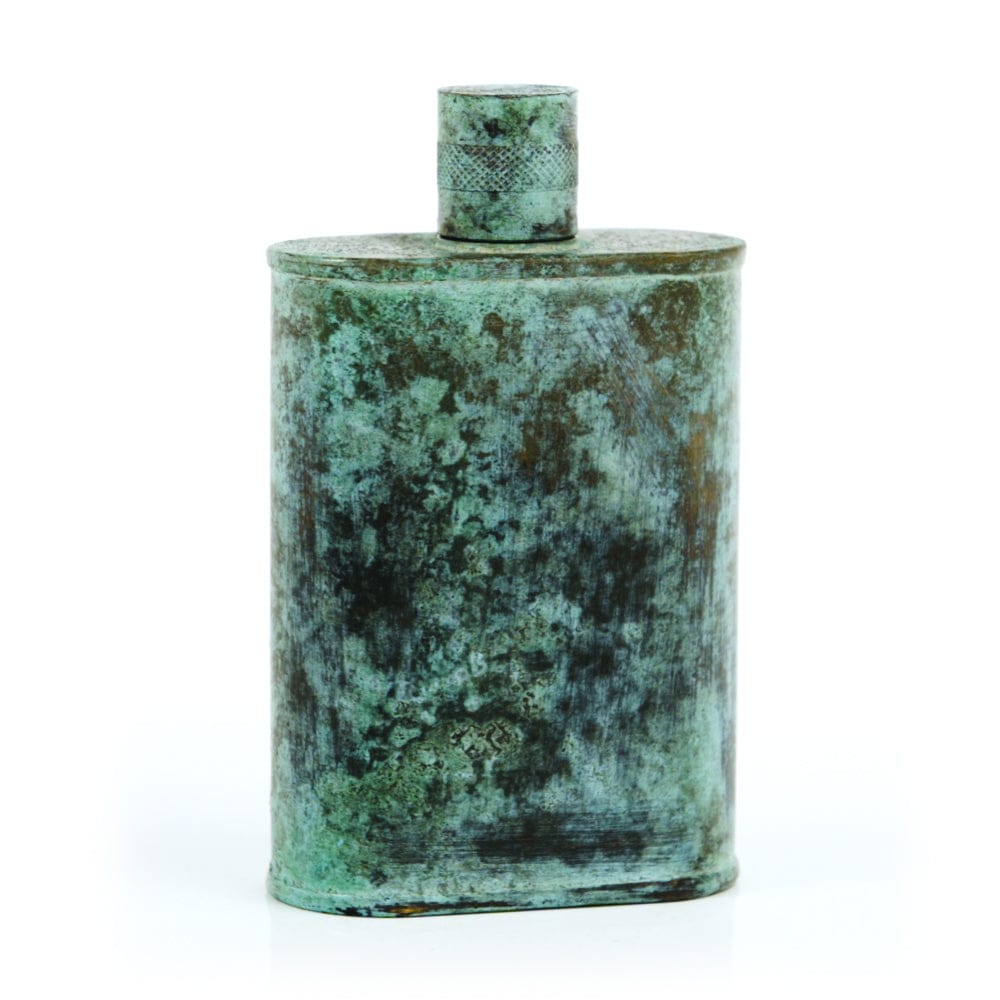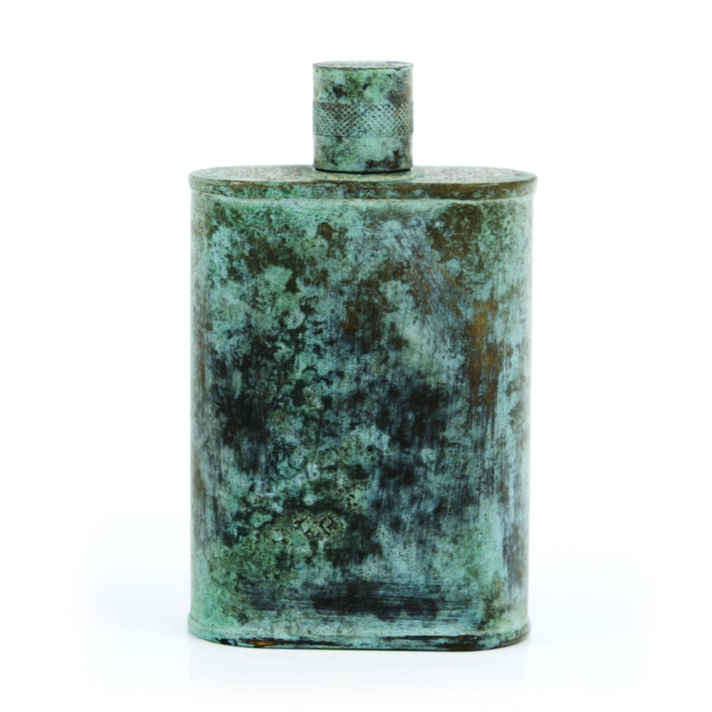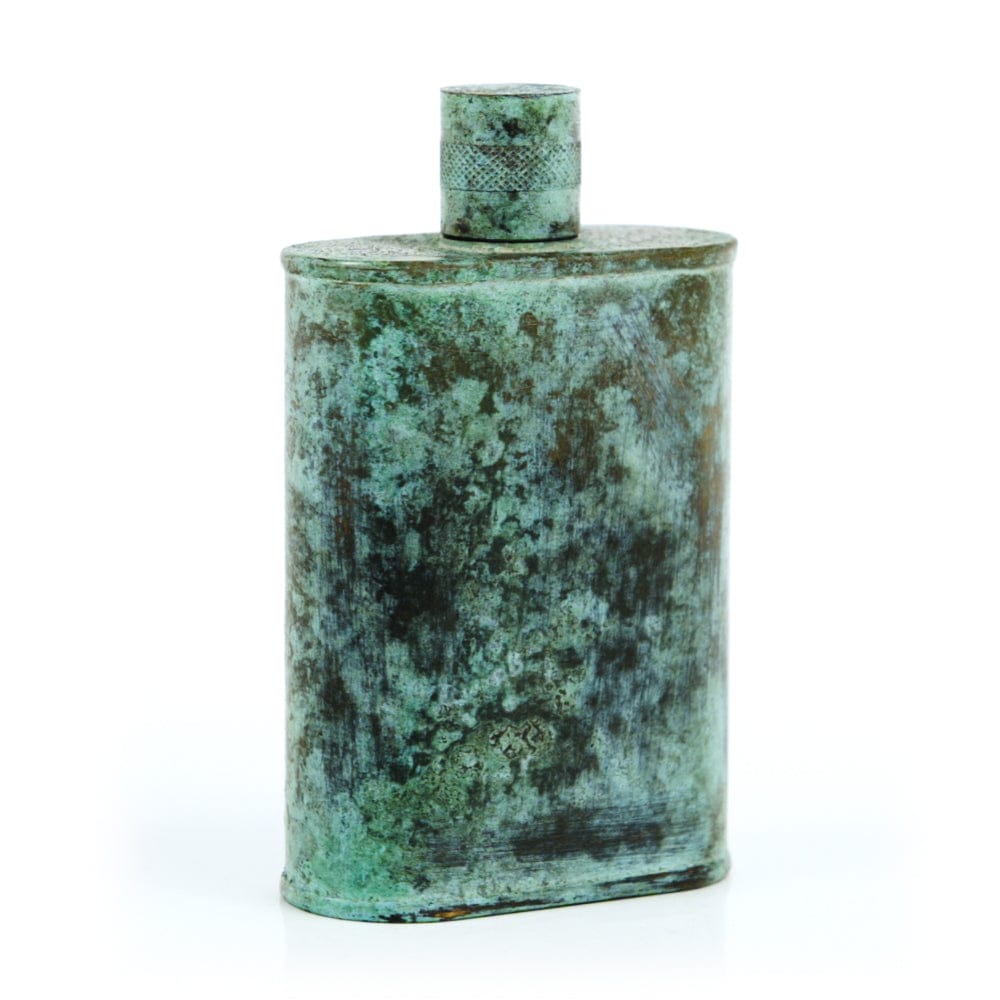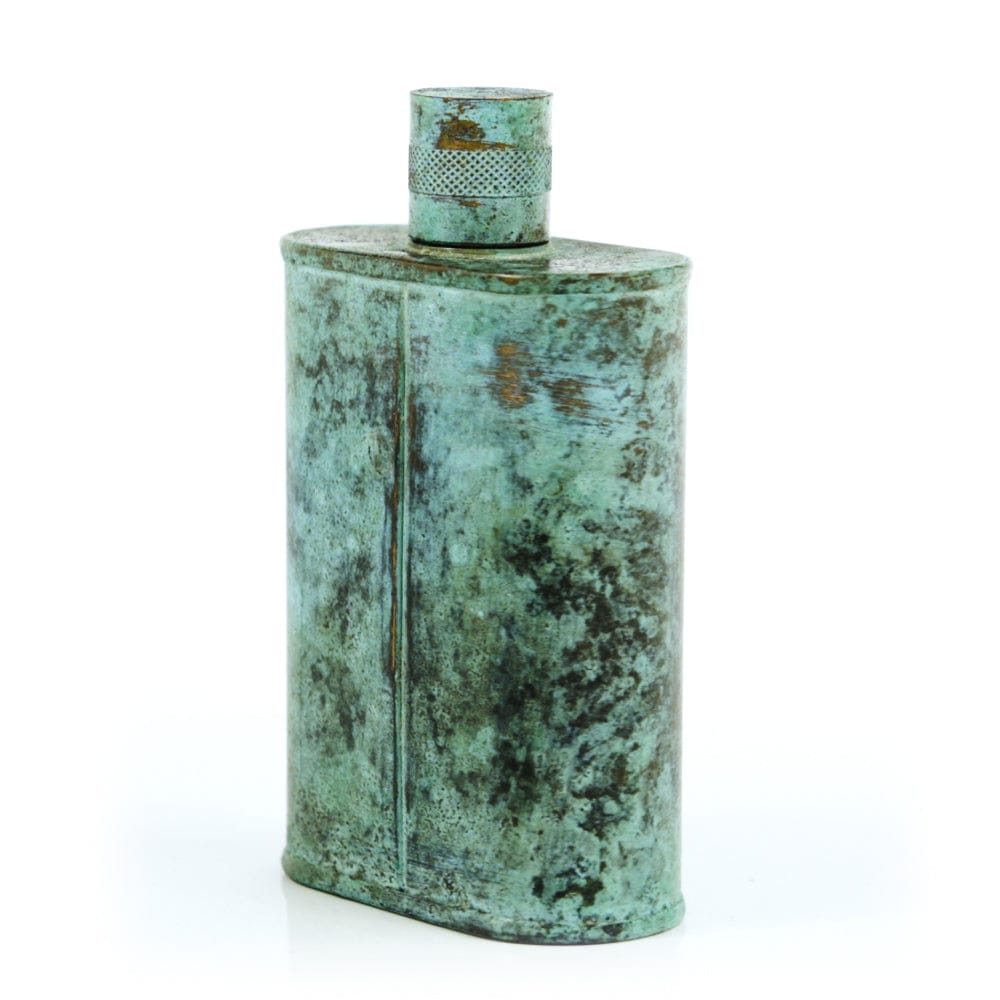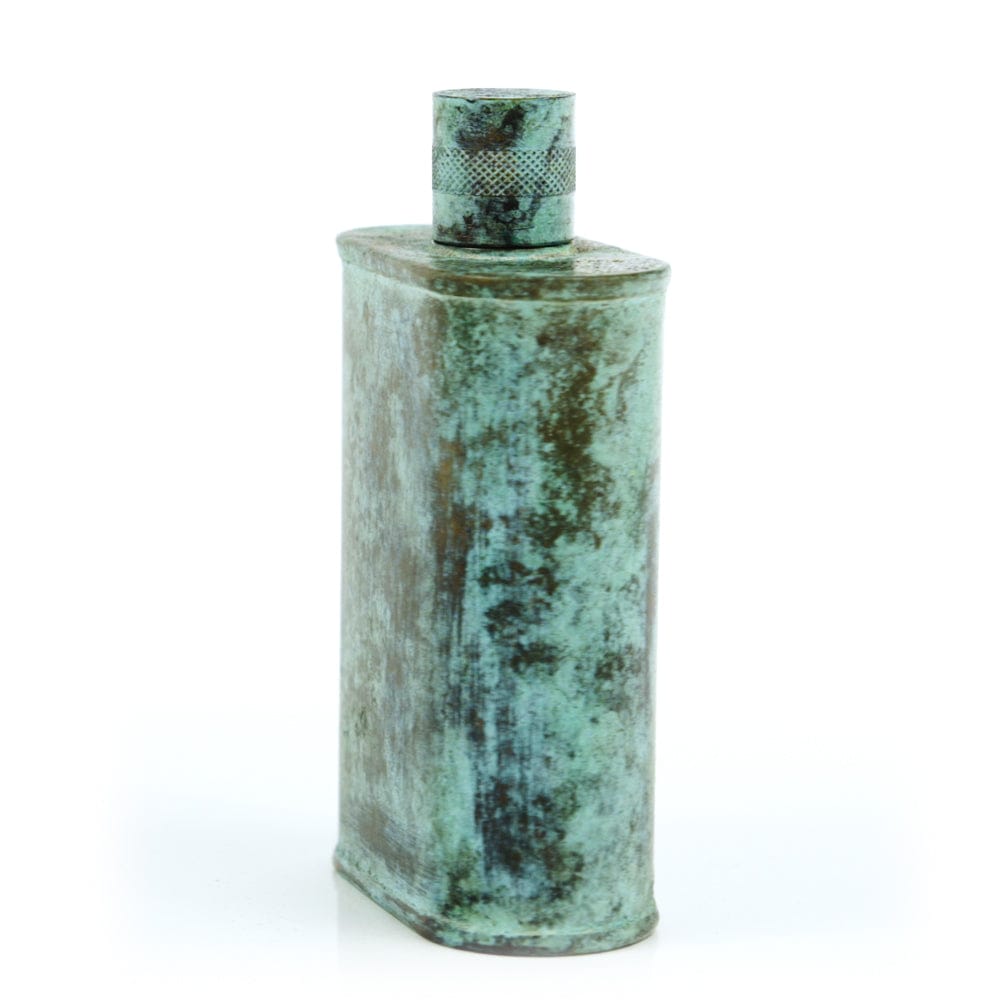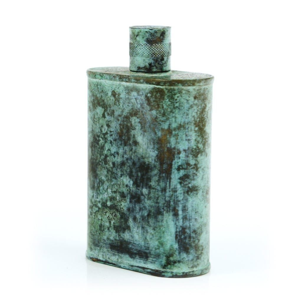 Pacific has been treated to take on a beautiful mottled green patina that gives it a vintage look, like it’s been allowed to oxidize and age. The patina is achieved through our proprietary 3-step process—intended to replicate 30 years of aging—which includes hyper-oxidizing, heat treating, and light painting, sanding, and finishing. Its body is made of 22 gauge solid copper—finished off with a unique patina—while molten, lead-free tin is applied to the interior using a lost process that's trade-secret to our company. The end result is a uniquely individual flask like no other.
