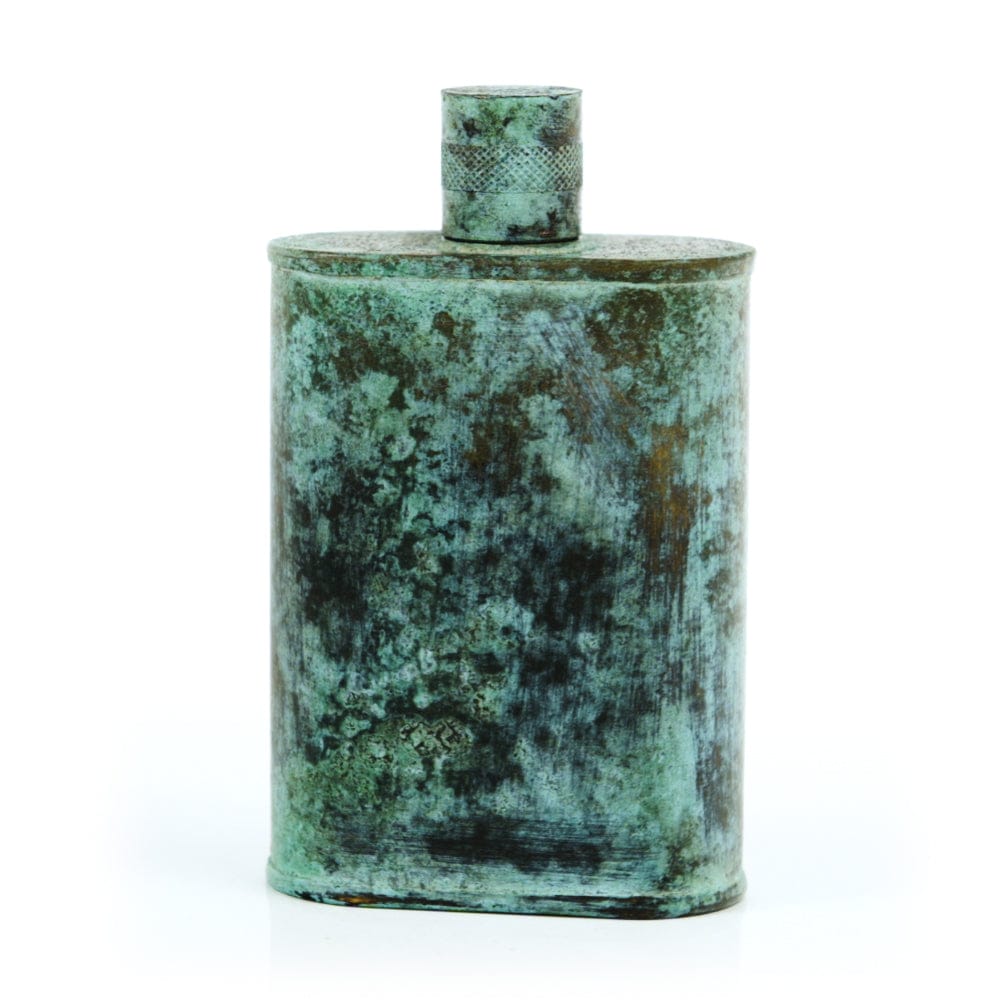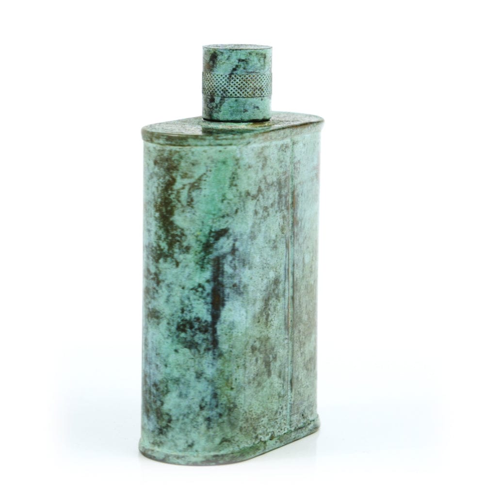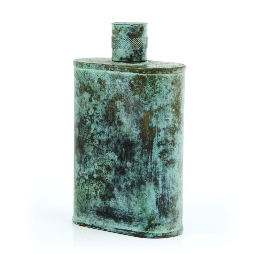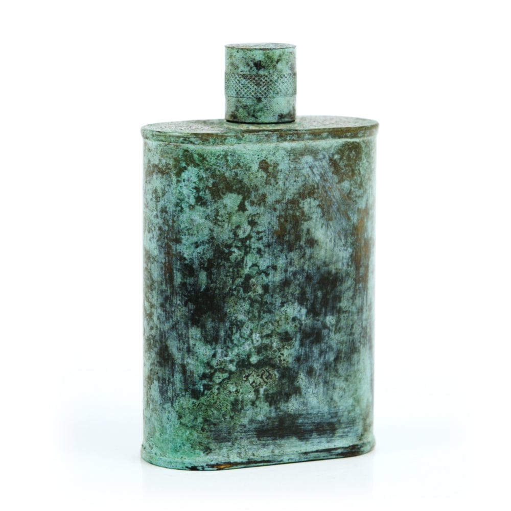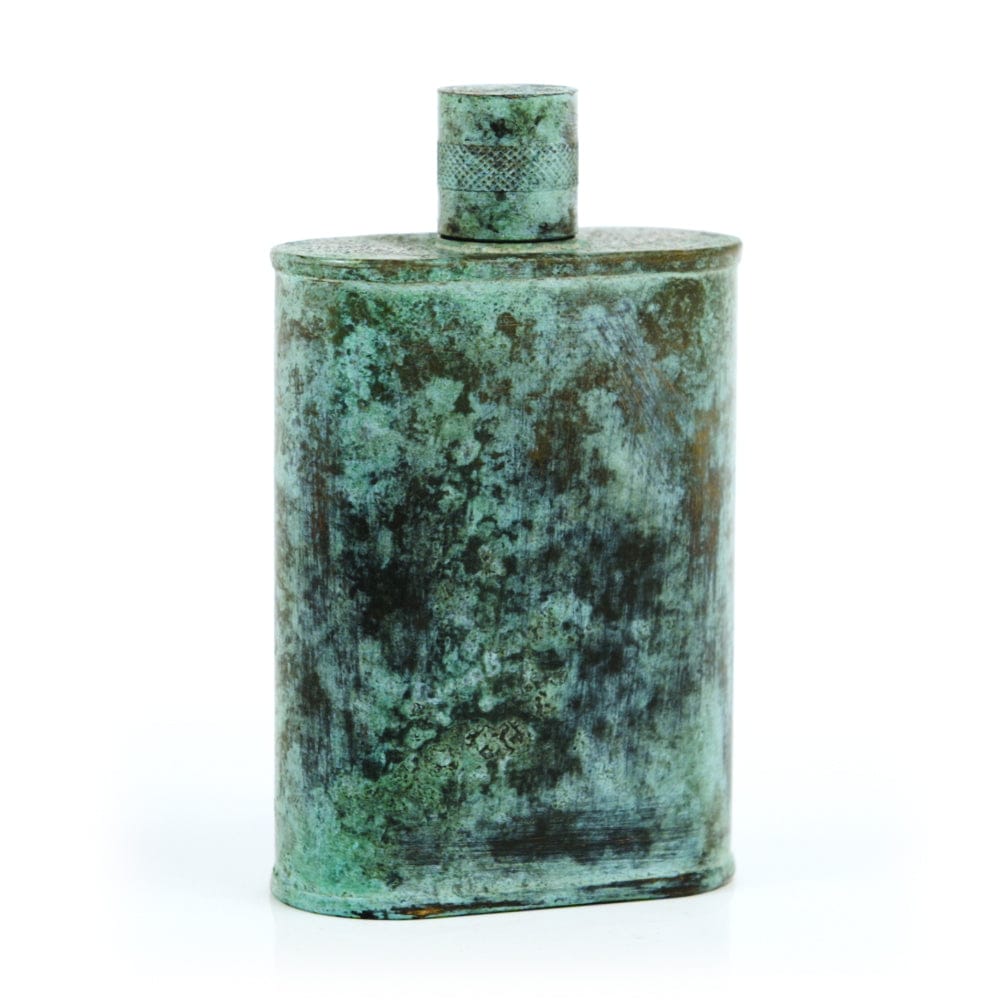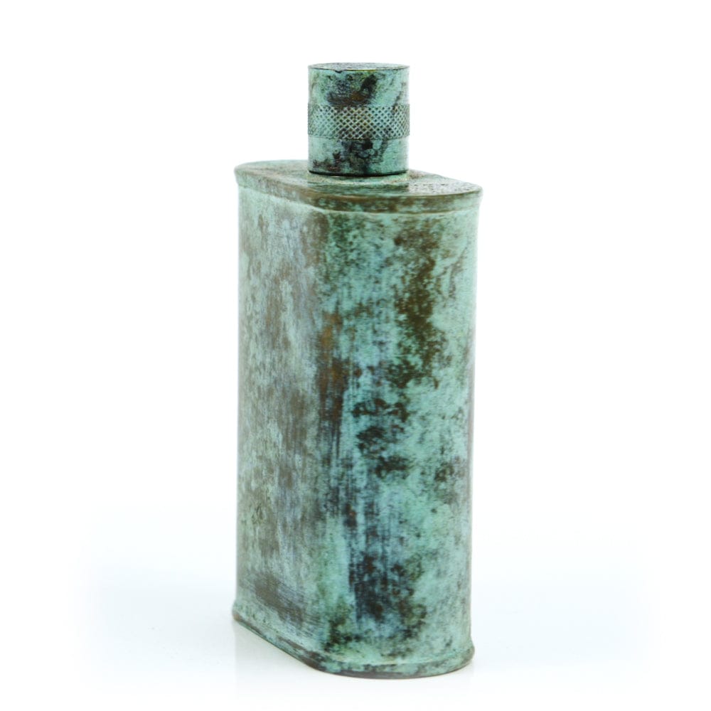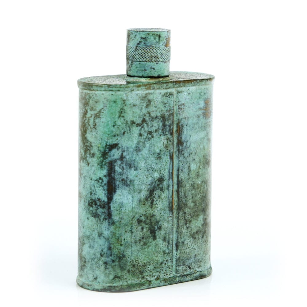 Pacific has been treated to take on a beautiful mottled green patina that gives it a vintage look, like it’s been allowed to oxidize and age. The patina is achieved through our proprietary 3-step process—intended to replicate 30 years of aging—which includes hyper-oxidizing, heat treating, and light painting, sanding, and finishing. Its body is made of 22 gauge solid copper—finished off with a unique patina—while molten, lead-free tin is applied to the interior using a lost process that's trade-secret to our company. The end result is a uniquely individual flask like no other.