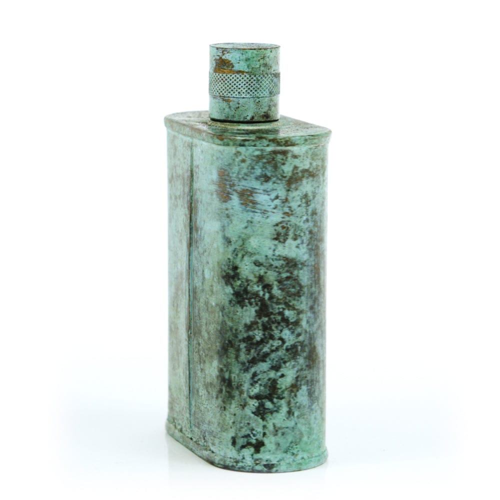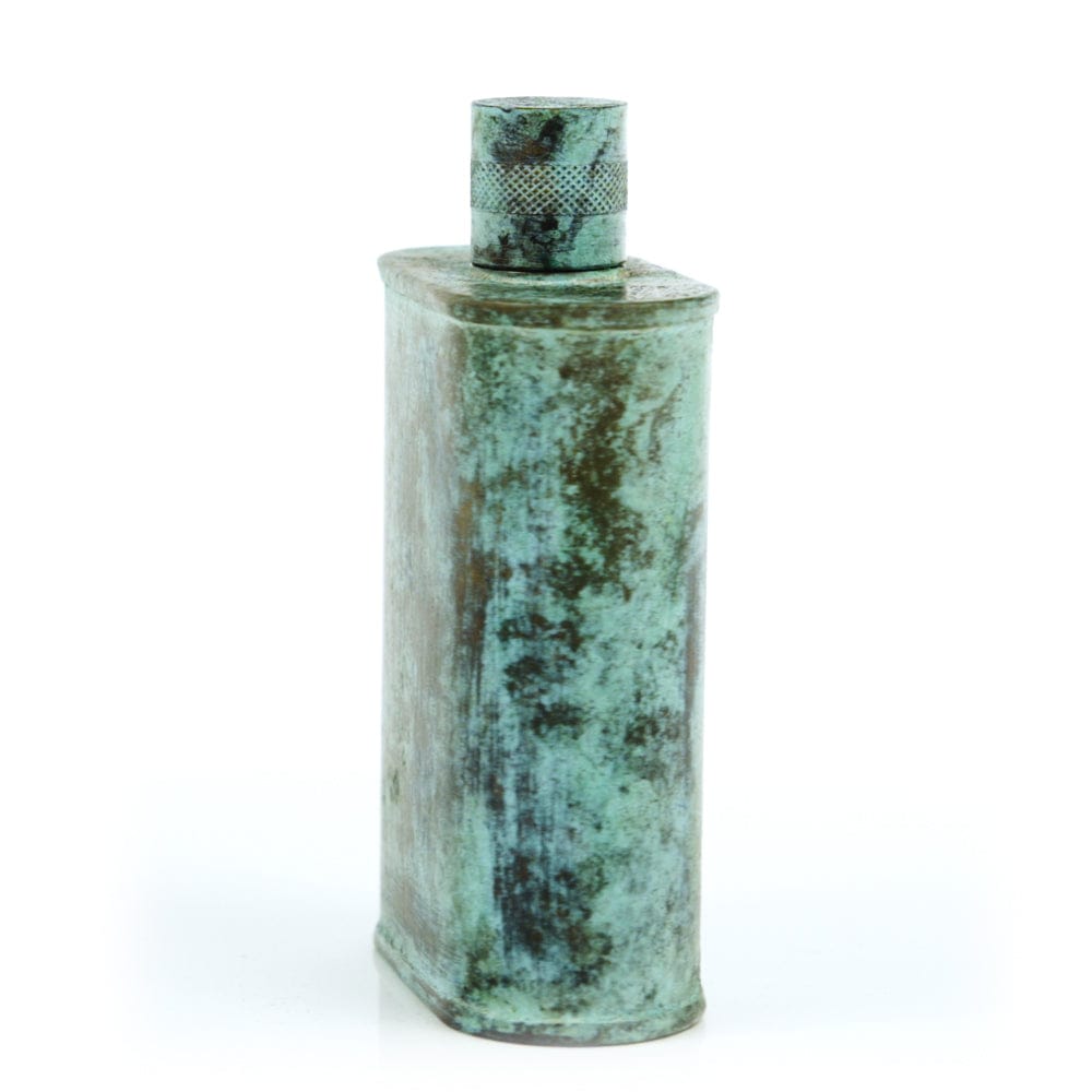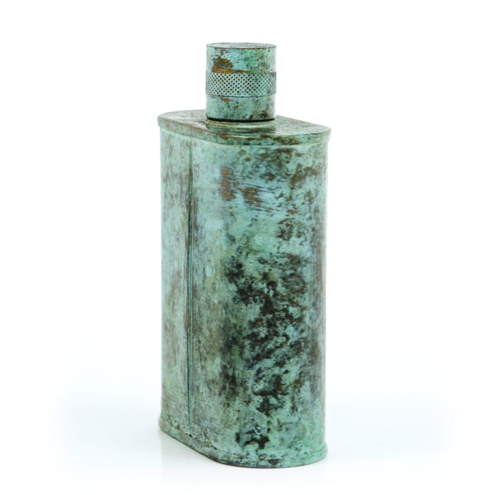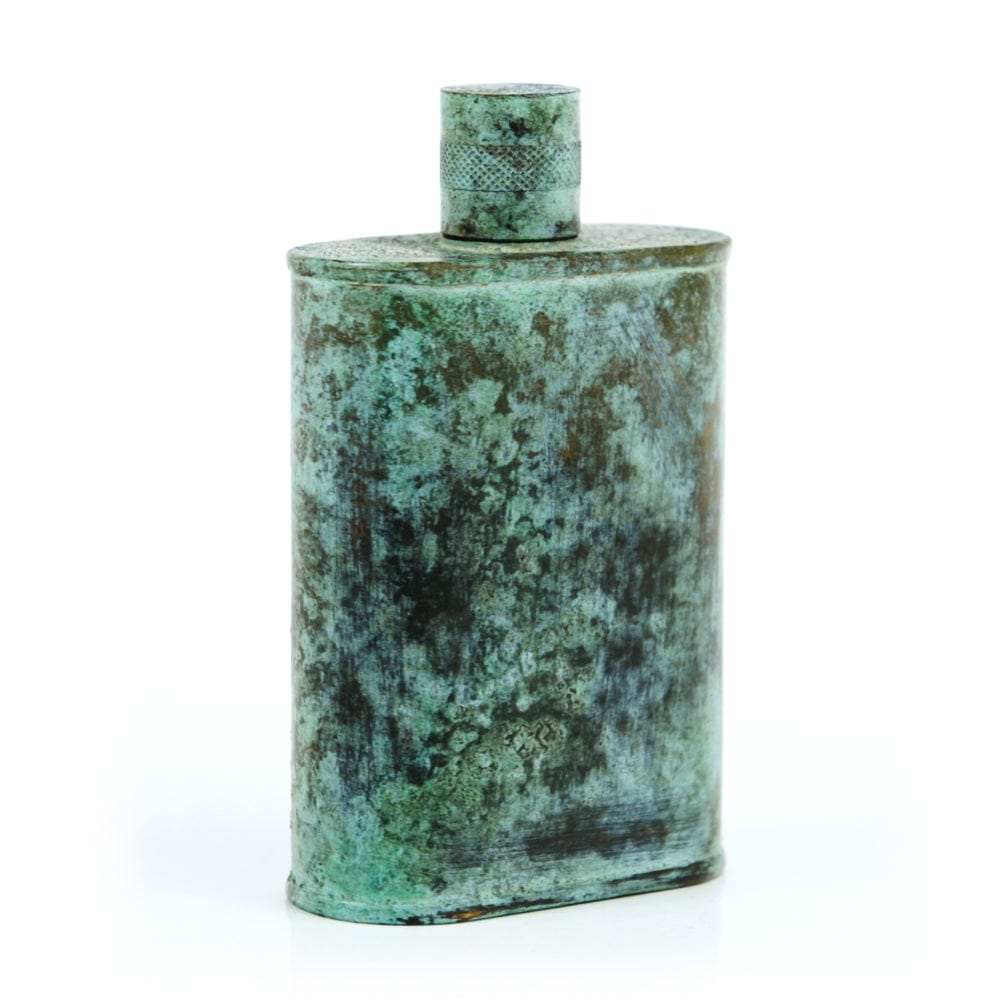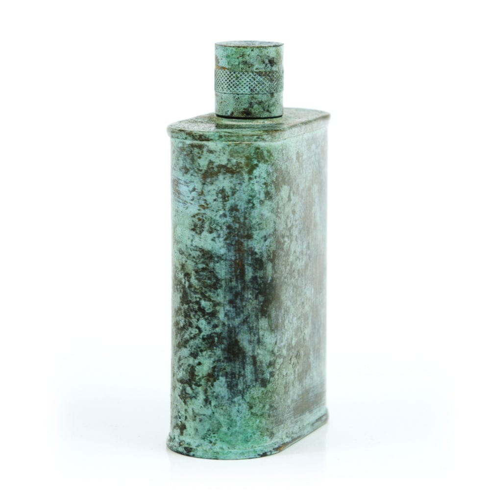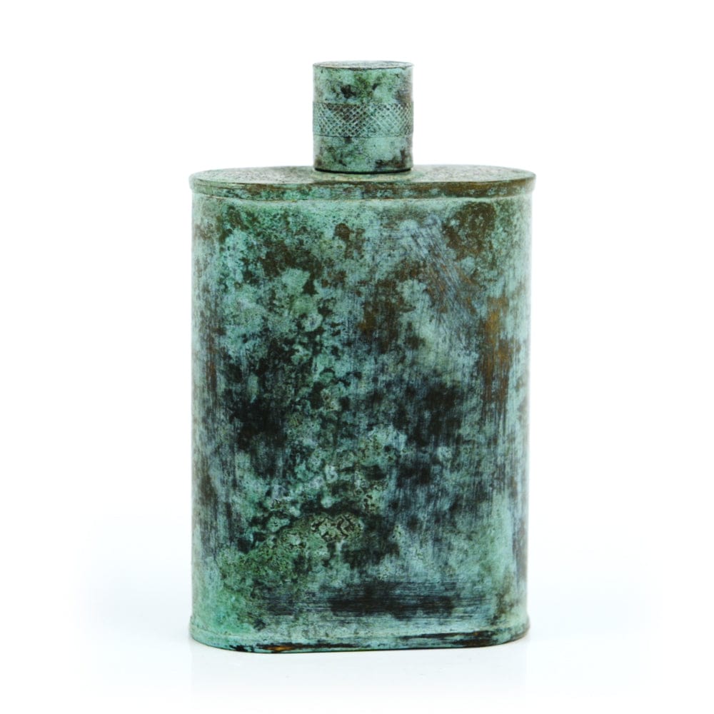 Pacific has been treated to take on a beautiful mottled green patina that gives it a vintage look, like it’s been allowed to oxidize and age. The patina is achieved through our proprietary 3-step process—intended to replicate 30 years of aging—which includes hyper-oxidizing, heat treating, and light painting, sanding, and finishing. Its body is made of 22 gauge solid copper—finished off with a unique patina—while molten, lead-free tin is applied to the interior using a lost process that's trade-secret to our company. The end result is a uniquely individual flask like no other.