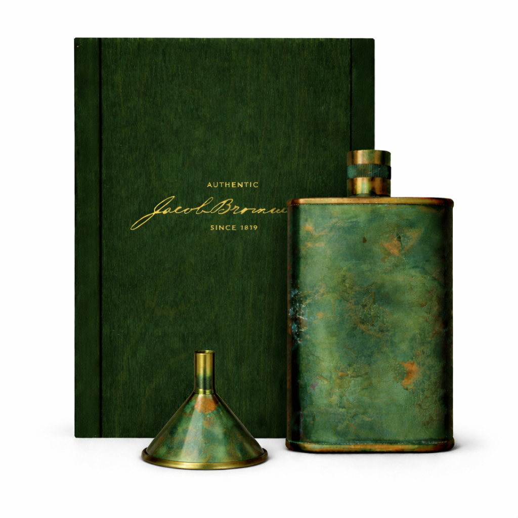 Through a meticulous anodizing process, rich emerald color is bonded directly into the metal itself—not painted or coated—creating a finish that becomes part of the copper rather than sitting on top of it. The result is a surface that is both remarkably durable and visually distinctive, with subtle variations in tone that give every flask its own character. Each Vermonter® — Anodized is crafted from solid copper and finished with careful precision, allowing the anodized surface to showcase the depth, richness, and natural character of the metal beneath. The emerald finish brings a bold new expression to one of Jacob Bromwell’s most enduring designs while preserving the timeless silhouette collectors have admired for generations. Each piece arrives as a complete collector’s set, housed in a custom green-stained presentation box and accompanied by a matching anodized funnel—crafted to complement the flask and complete the experience.